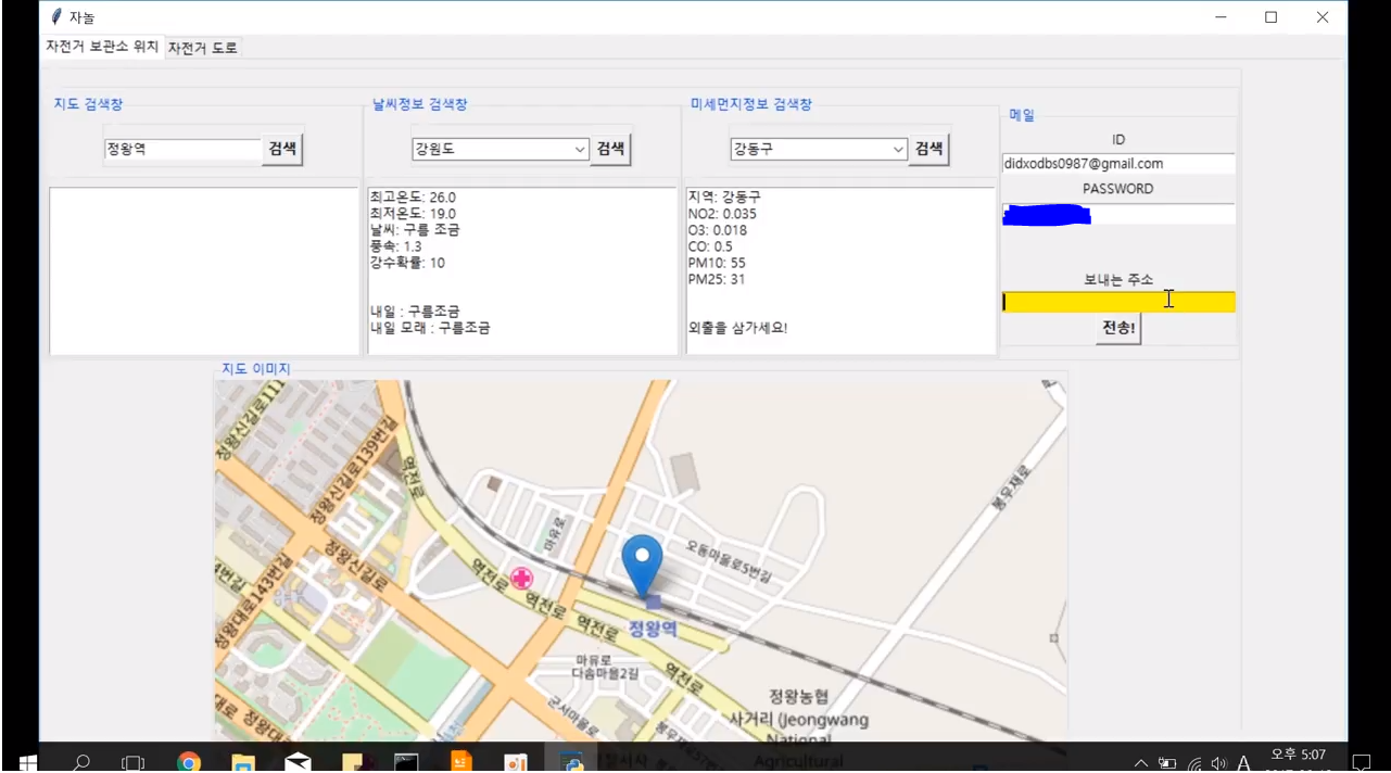 - 지도 사진과 날씨, 미세먼지 정보를 메일로 보낼 수 있습니다.