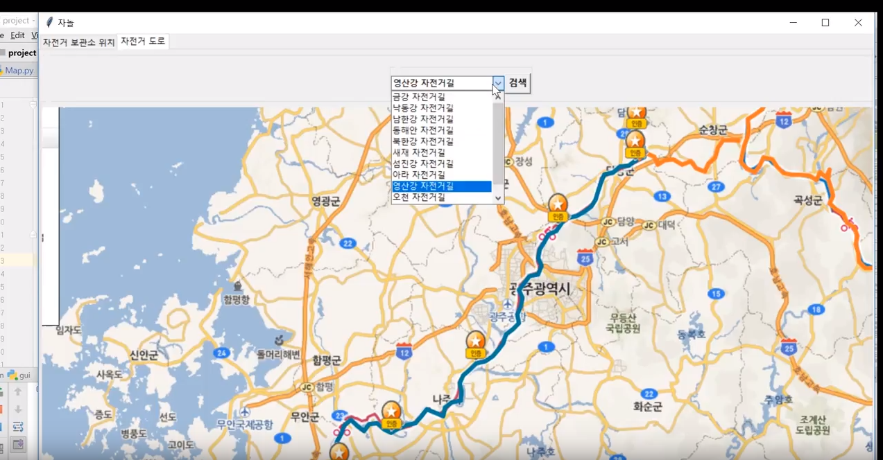 제작 당시 웹버전이 아닌 python application에서 쓸 수 있는 지도 API가 없었습니다. 지도를 웹페이지 상에서 띄우고 웹페이지에서 지도 사진을 얻어와 띄우는 방식으로 구현하였습니다.